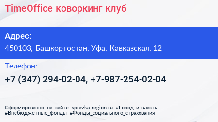 TimeOffice, коворкинг-клуб по адресу 450103, Башкортостан, Уфа, Кавказская, 12 в дальнейшем Организация, размещена в следующих категориях: