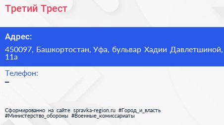 Третий Трест по адресу 450097, Башкортостан, Уфа, бульвар Хадии Давлетшиной, 11а в дальнейшем Организация, размещена в следующих категориях: