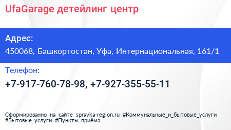 UfaGarage, детейлинг-центр по адресу 450068, Башкортостан, Уфа, Интернациональная, 161/1 в дальнейшем Организация, размещена в следующих категориях: