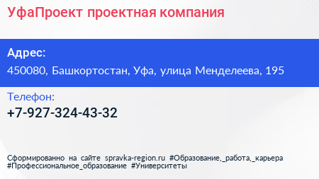 УфаПроект, проектная компания по адресу 450080, Башкортостан, Уфа, улица Менделеева, 195 в дальнейшем Организация, размещена в следующих категориях: