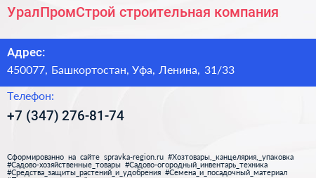 УралПромСтрой, строительная компания по адресу 450077, Башкортостан, Уфа, Ленина, 31/33 в дальнейшем Организация, размещена в следующих категориях: