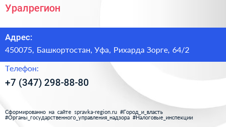 Для связи с организацией воспользуйтесь номером телефона: +7 (347) 298-88-80. Пн: c 09:00-18:00, Вт: c 09:00-18:00, Ср: c 09:00-18:00, Чт: c 09:00-18:00, Пт: c 09:00-18:00, Сб: выходной, Вс: выходной, вы можете обратиться в эту организацию.