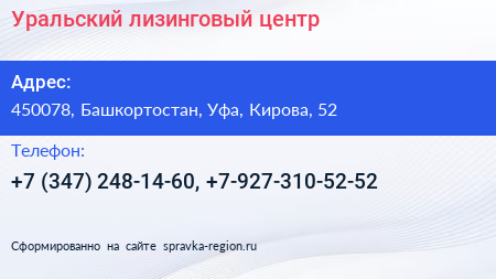 Уральский лизинговый центр по адресу 450078, Башкортостан, Уфа, Кирова, 52 в дальнейшем Организация, размещена в следующих категориях: