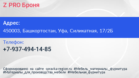 Z-PRO Броня по адресу 450003, Башкортостан, Уфа, Силикатная, 17/2Б в дальнейшем Организация, размещена в следующих категориях: