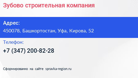 Зубово, строительная компания по адресу 450078, Башкортостан, Уфа, Кирова, 52 в дальнейшем Организация, размещена в следующих категориях: