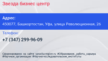 Звезда, бизнес центр по адресу 450077, Башкортостан, Уфа, улица Революционная, 26 в дальнейшем Организация, размещена в следующих категориях: