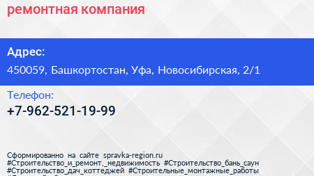 ремонтная компания по адресу 450059, Башкортостан, Уфа, Новосибирская, 2/1 в дальнейшем Организация, размещена в следующих категориях:
