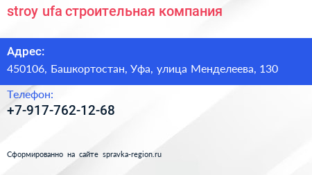 stroy-ufa, строительная компания по адресу 450106, Башкортостан, Уфа, улица Менделеева, 130 в дальнейшем Организация, размещена в следующих категориях: