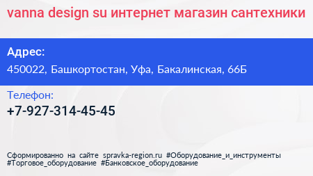 vanna-design.su, интернет-магазин сантехники по адресу 450022, Башкортостан, Уфа, Бакалинская, 66Б в дальнейшем Организация, размещена в следующих категориях: