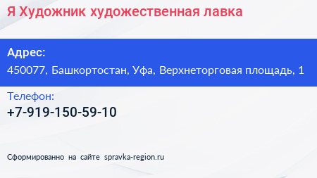 Я-Художник, художественная лавка по адресу 450077, Башкортостан, Уфа, Верхнеторговая площадь, 1 в дальнейшем Организация, размещена в следующих категориях: