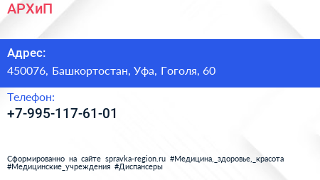 АРХиП по адресу 450076, Башкортостан, Уфа, Гоголя, 60 в дальнейшем Организация, размещена в следующих категориях: