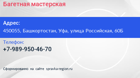 Багетная мастерская по адресу 450055, Башкортостан, Уфа, улица Российская, 60Б в дальнейшем Организация, размещена в следующих категориях: