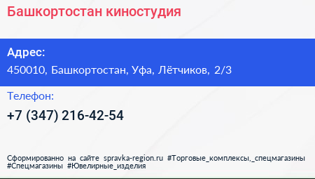 Башкортостан, киностудия по адресу 450010, Башкортостан, Уфа, Лётчиков, 2/3 в дальнейшем Организация, размещена в следующих категориях: