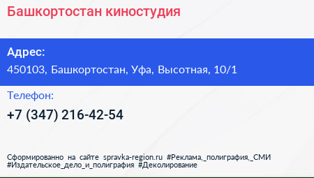 Башкортостан, киностудия по адресу 450103, Башкортостан, Уфа, Высотная, 10/1 в дальнейшем Организация, размещена в следующих категориях: