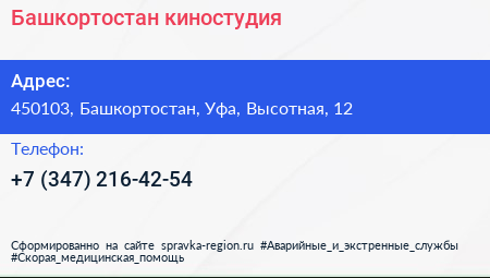 Башкортостан, киностудия по адресу 450103, Башкортостан, Уфа, Высотная, 12 в дальнейшем Организация, размещена в следующих категориях: