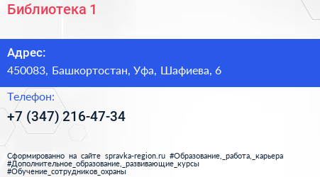 Библиотека №1 по адресу 450083, Башкортостан, Уфа, Шафиева, 6 в дальнейшем Организация, размещена в следующих категориях: