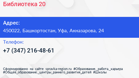 Библиотека №20 по адресу 450022, Башкортостан, Уфа, Акназарова, 24 в дальнейшем Организация, размещена в следующих категориях: