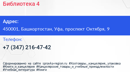 Библиотека №4 по адресу 450001, Башкортостан, Уфа, проспект Октября, 9 в дальнейшем Организация, размещена в следующих категориях: