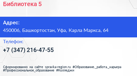 Библиотека №5 по адресу 450006, Башкортостан, Уфа, Карла Маркса, 64 в дальнейшем Организация, размещена в следующих категориях: