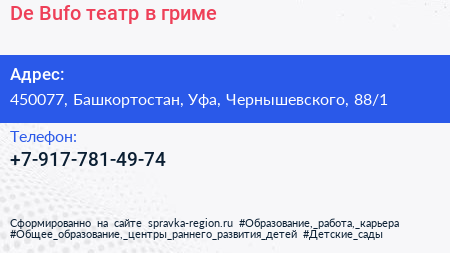 De Bufo, театр в гриме по адресу 450077, Башкортостан, Уфа, Чернышевского, 88/1 в дальнейшем Организация, размещена в следующих категориях: