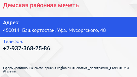 Демская районная мечеть по адресу 450014, Башкортостан, Уфа, Мусоргского, 48 в дальнейшем Организация, размещена в следующих категориях:
