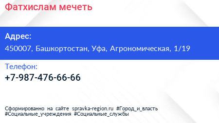Фатхислам, мечеть по адресу 450007, Башкортостан, Уфа, Агрономическая, 1/19 в дальнейшем Организация, размещена в следующих категориях: