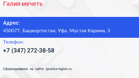Галия, мечеть по адресу 450077, Башкортостан, Уфа, Мустая Карима, 3 в дальнейшем Организация, размещена в следующих категориях:
