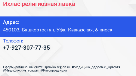 Ихлас, религиозная лавка по адресу 450103, Башкортостан, Уфа, Кавказская, 6 киоск в дальнейшем Организация, размещена в следующих категориях: