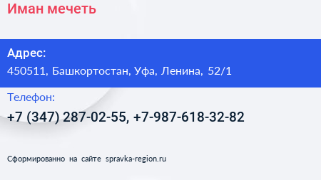 Иман, мечеть по адресу 450511, Башкортостан, Уфа, Ленина, 52/1 в дальнейшем Организация, размещена в следующих категориях: