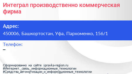 Интеграл, производственно-коммерческая фирма по адресу 450006, Башкортостан, Уфа, Пархоменко, 156/1 в дальнейшем Организация, размещена в следующих категориях: