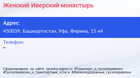Женский Иверский монастырь по адресу 450039, Башкортостан, Уфа, Ферина, 15 к4 в дальнейшем Организация, размещена в следующих категориях: