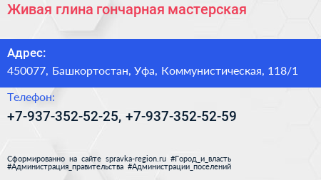Живая глина, гончарная мастерская по адресу 450077, Башкортостан, Уфа, Коммунистическая, 118/1 в дальнейшем Организация, размещена в следующих категориях: