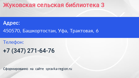 Жуковская сельская библиотека №3 по адресу 450570, Башкортостан, Уфа, Трактовая, 6 в дальнейшем Организация, размещена в следующих категориях:
