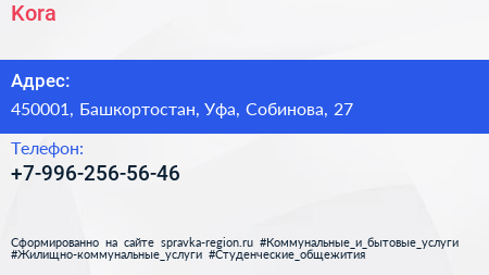 Kora по адресу 450001, Башкортостан, Уфа, Собинова, 27 в дальнейшем Организация, размещена в следующих категориях: