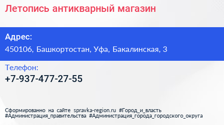 Летопись, антикварный магазин по адресу 450106, Башкортостан, Уфа, Бакалинская, 3 в дальнейшем Организация, размещена в следующих категориях: