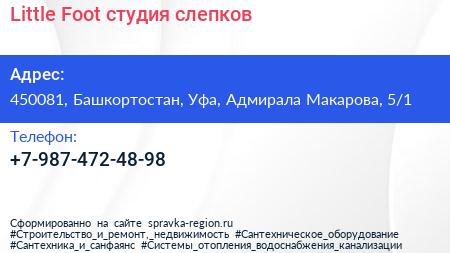 Little Foot, студия слепков по адресу 450081, Башкортостан, Уфа, Адмирала Макарова, 5/1 в дальнейшем Организация, размещена в следующих категориях: