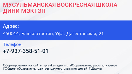 МУСУЛЬМАНСКАЯ ВОСКРЕСНАЯ ШКОЛА ДИНИ МЭКТЭП по адресу 450014, Башкортостан, Уфа, Дагестанская, 21 в дальнейшем Организация, размещена в следующих категориях: