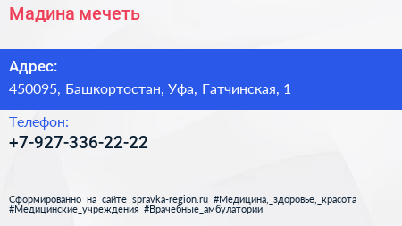 Мадина, мечеть по адресу 450095, Башкортостан, Уфа, Гатчинская, 1 в дальнейшем Организация, размещена в следующих категориях: