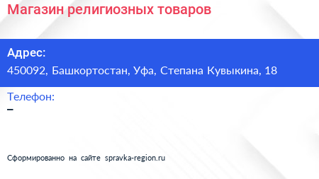 Магазин религиозных товаров по адресу 450092, Башкортостан, Уфа, Степана Кувыкина, 18 в дальнейшем Организация, размещена в следующих категориях: