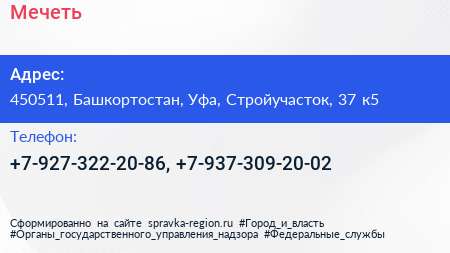 Мечеть по адресу 450511, Башкортостан, Уфа, Стройучасток, 37 к5 в дальнейшем Организация, размещена в следующих категориях: