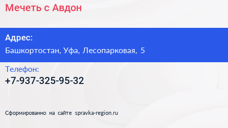 Мечеть, с. Авдон по адресу Башкортостан, Уфа, Лесопарковая, 5 в дальнейшем Организация, размещена в следующих категориях: