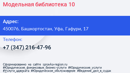 Модельная библиотека №10 по адресу 450076, Башкортостан, Уфа, Гафури, 17 в дальнейшем Организация, размещена в следующих категориях: