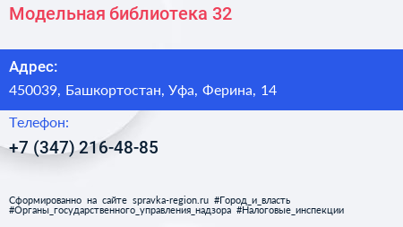 Модельная библиотека №32 по адресу 450039, Башкортостан, Уфа, Ферина, 14 в дальнейшем Организация, размещена в следующих категориях: