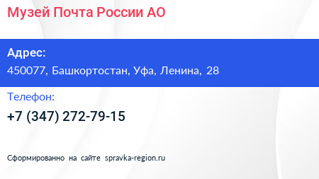 Музей, Почта России, АО по адресу 450077, Башкортостан, Уфа, Ленина, 28 в дальнейшем Организация, размещена в следующих категориях: