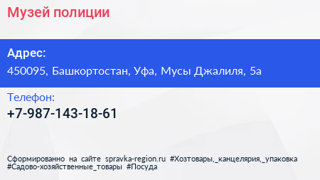 Музей полиции по адресу 450095, Башкортостан, Уфа, Мусы Джалиля, 5а в дальнейшем Организация, размещена в следующих категориях: