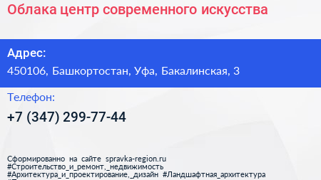 Облака, центр современного искусства по адресу 450106, Башкортостан, Уфа, Бакалинская, 3 в дальнейшем Организация, размещена в следующих категориях: