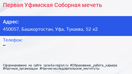 Первая Уфимская Соборная мечеть по адресу 450057, Башкортостан, Уфа, Тукаева, 52 к2 в дальнейшем Организация, размещена в следующих категориях: