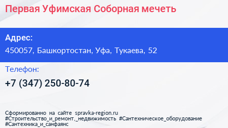 Первая Уфимская Соборная мечеть по адресу 450057, Башкортостан, Уфа, Тукаева, 52 в дальнейшем Организация, размещена в следующих категориях: