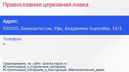 Православная церковная лавка по адресу 450105, Башкортостан, Уфа, Академика Королёва, 14/1 в дальнейшем Организация, размещена в следующих категориях: