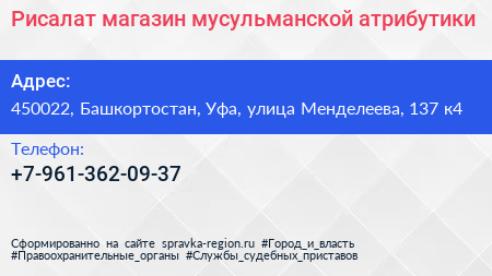 Рисалат, магазин мусульманской атрибутики по адресу 450022, Башкортостан, Уфа, улица Менделеева, 137 к4 в дальнейшем Организация, размещена в следующих категориях: